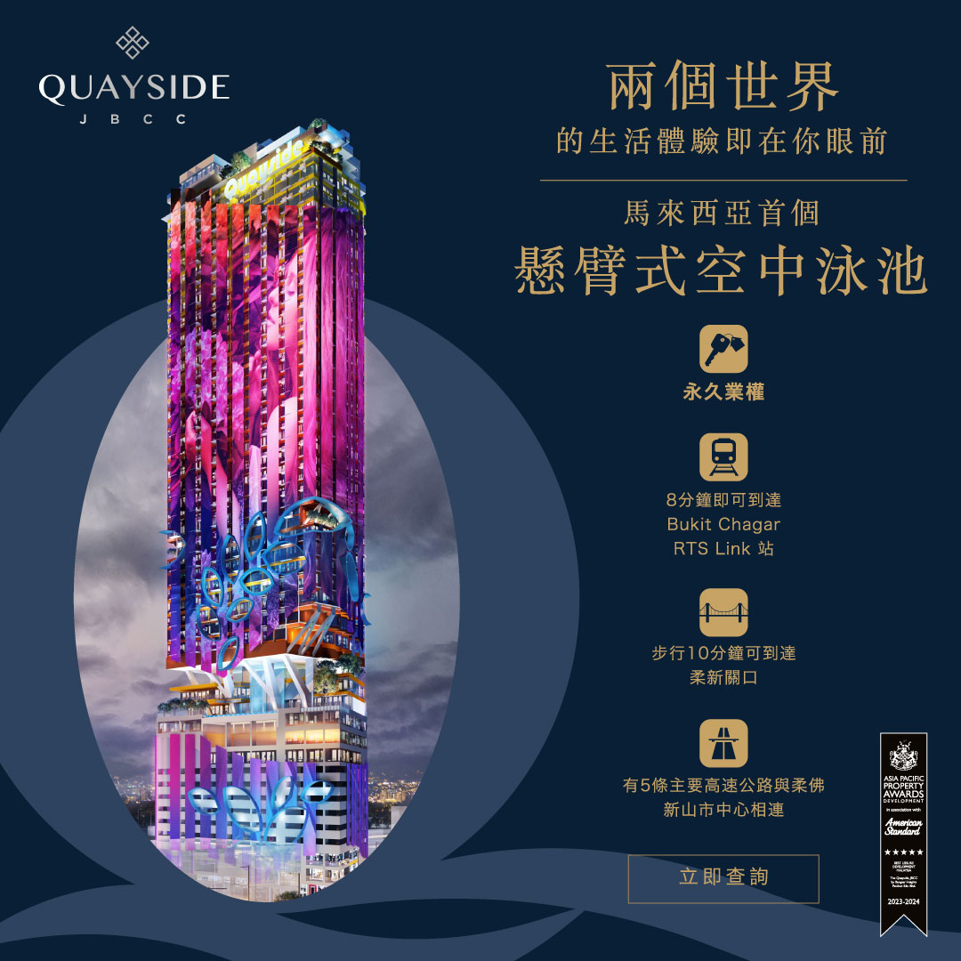 位於柔佛新山市中心的 Quayside JBCC,擁有無與倫比,令人驚嘆的新加坡天際線美景,地理位置絕佳。在這裡,您將享受到城市的活力、絕對的便利、藝術、文化和令人滿意的購物體驗。精緻、高品質的設計套房,將讓您的非凡生活提升至新層次。
