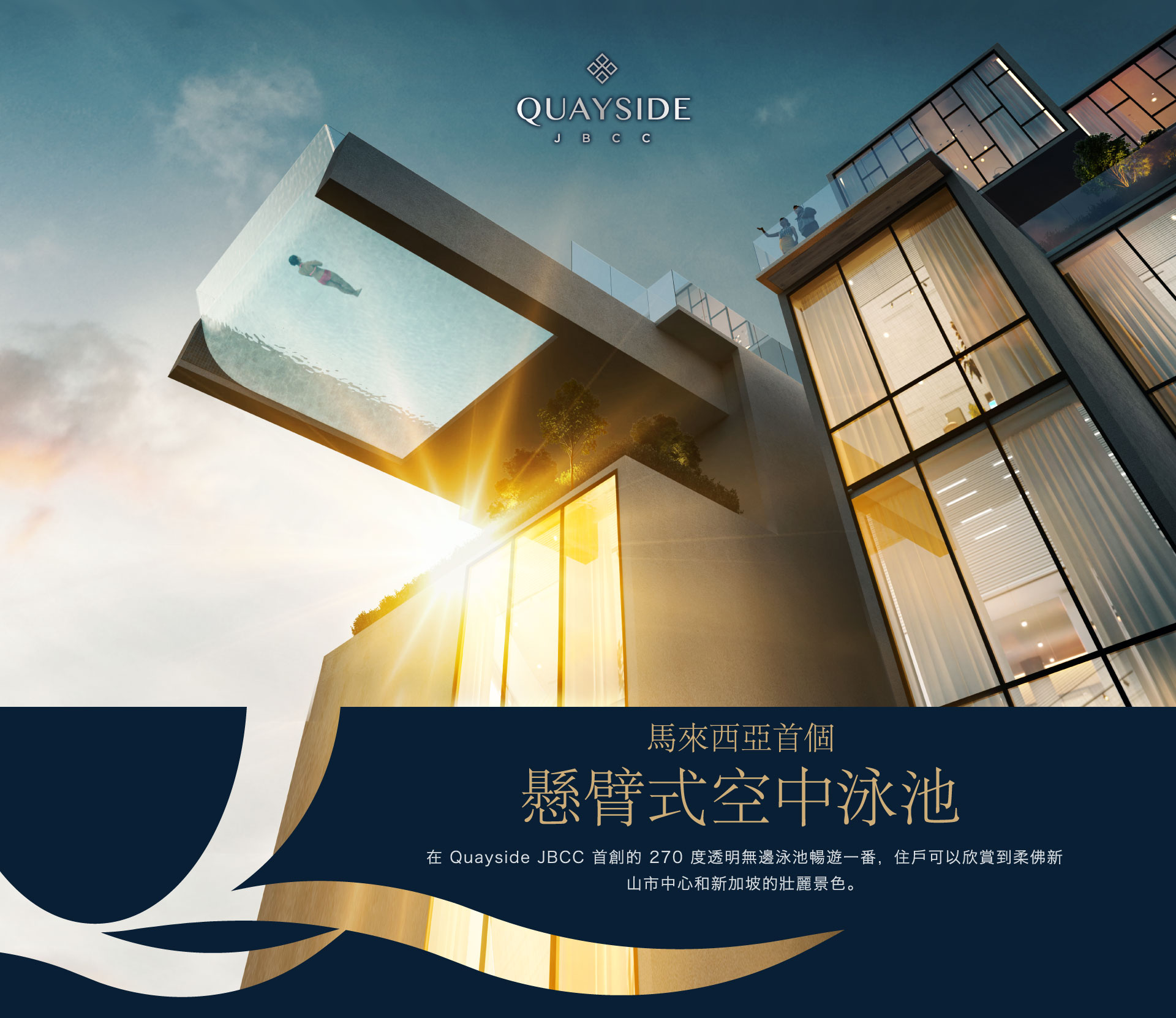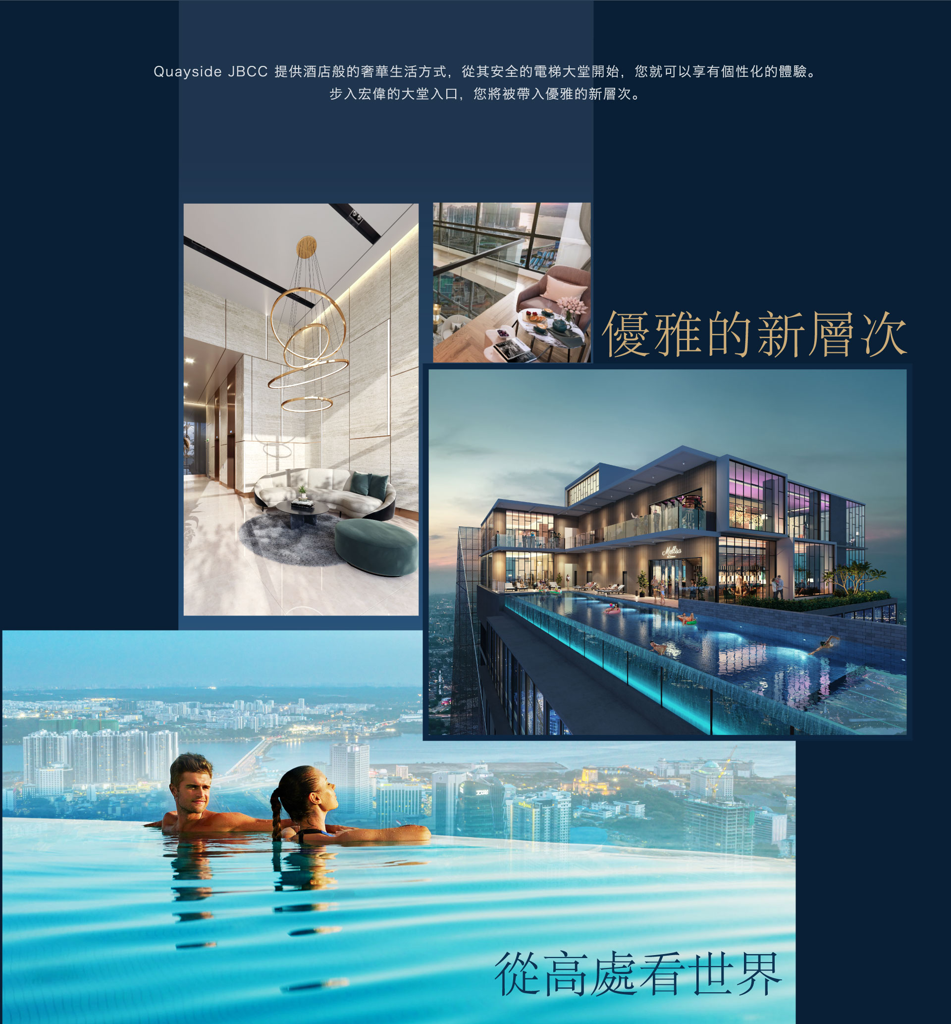 位於柔佛新山市中心的 Quayside JBCC,擁有無與倫比,令人驚嘆的新加坡天際線美景,地理位置絕佳。在這裡,您將享受到城市的活力、絕對的便利、藝術、文化和令人滿意的購物體驗。精緻、高品質的設計套房,將讓您的非凡生活提升至新層次。