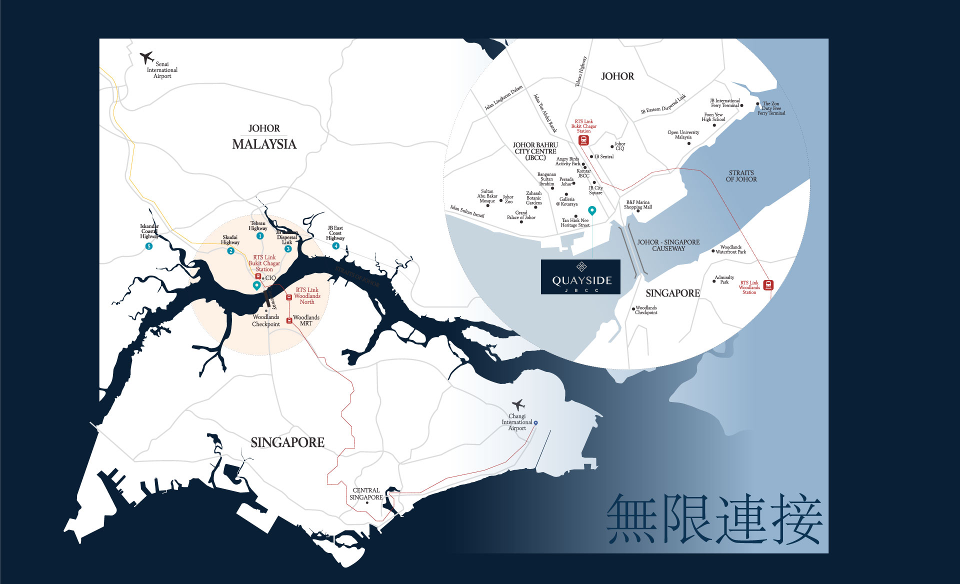 Quayside JBCC 位於柔佛新山市中心和新加坡之間,提供了一個享受兩全其美的獨特機會。它在最搶手的位置引入了全新的奢華體驗,距離即將到來的柔佛新山 – 新加坡捷運系統(RTS)僅幾步之遙,實現了便利的城市生活方式和便捷的交通。